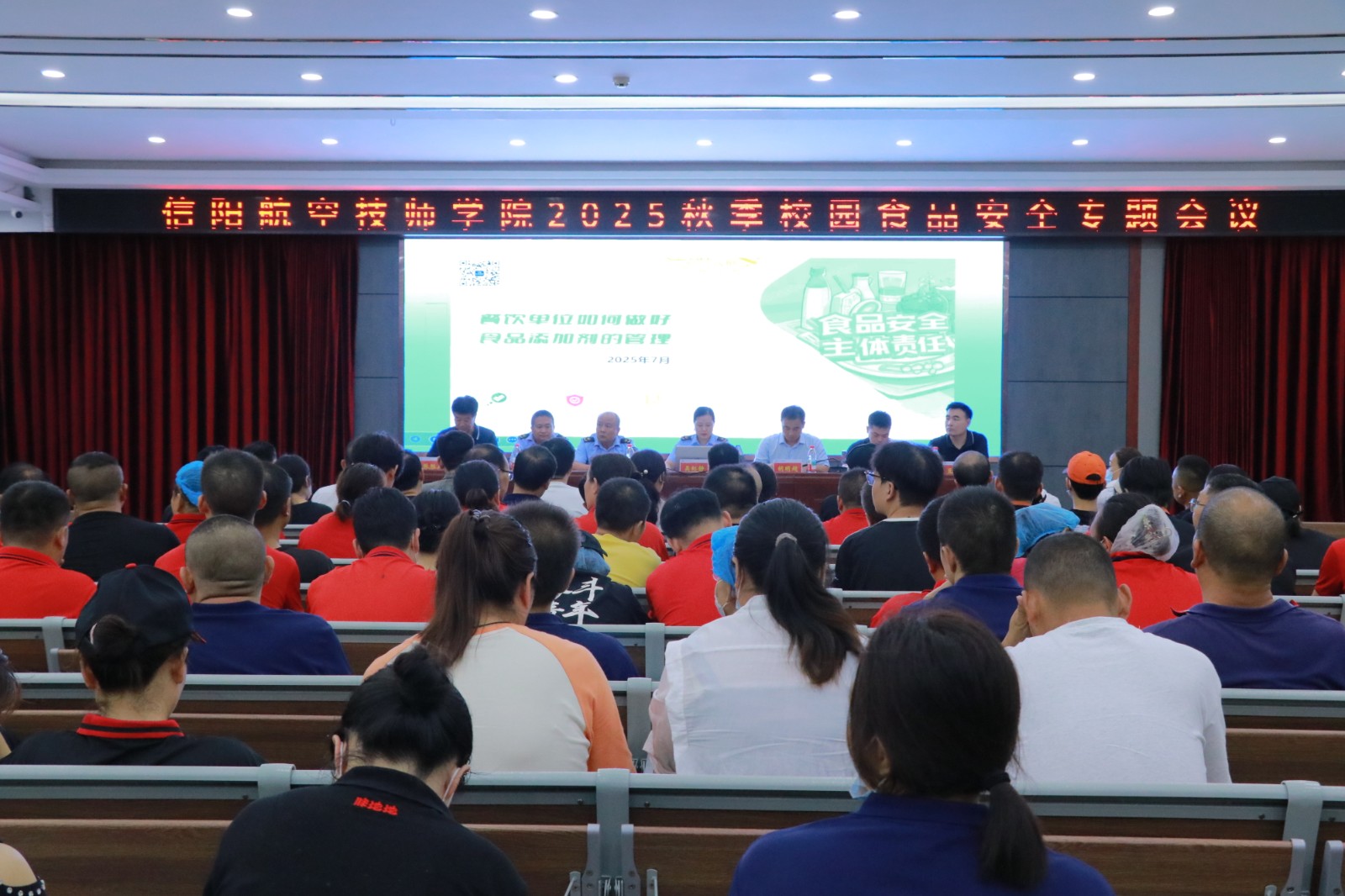 为筑牢校园食品安全防线,保障全体师生饮食健康,2025年9月11日下午14时,信阳航空技师学院在教学楼一楼大会议室召开2025年秋季校园食品安全专题会议。平桥区市场监督管理局震雷山市场监管所吴虹静所长;程林科长;李强主任;信阳航空职业学院五年制学院扶建书记;信阳航空技师学院胡明超副校长;信阳航空职业学院食品安全总监豆浩经理;学院全体商户员工参加会议。会议由后勤处副处长张胜兵主持。