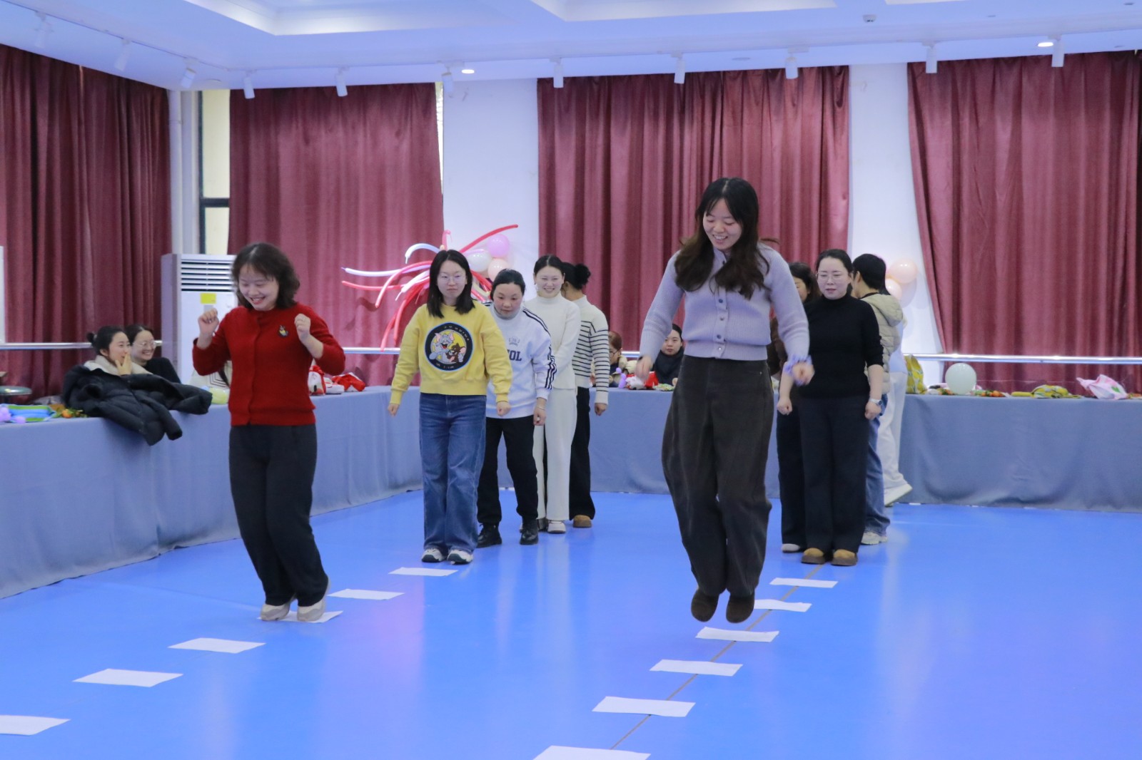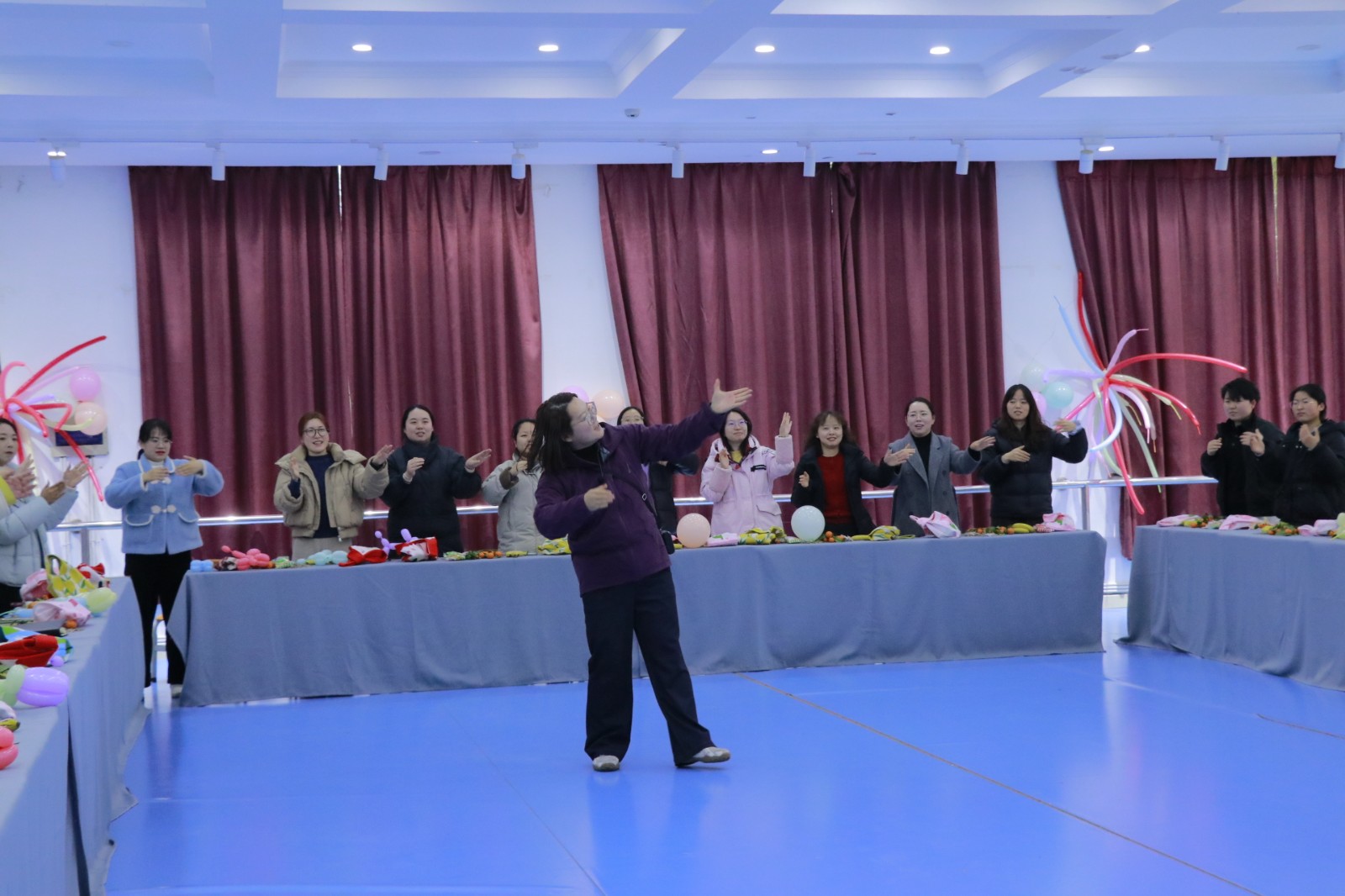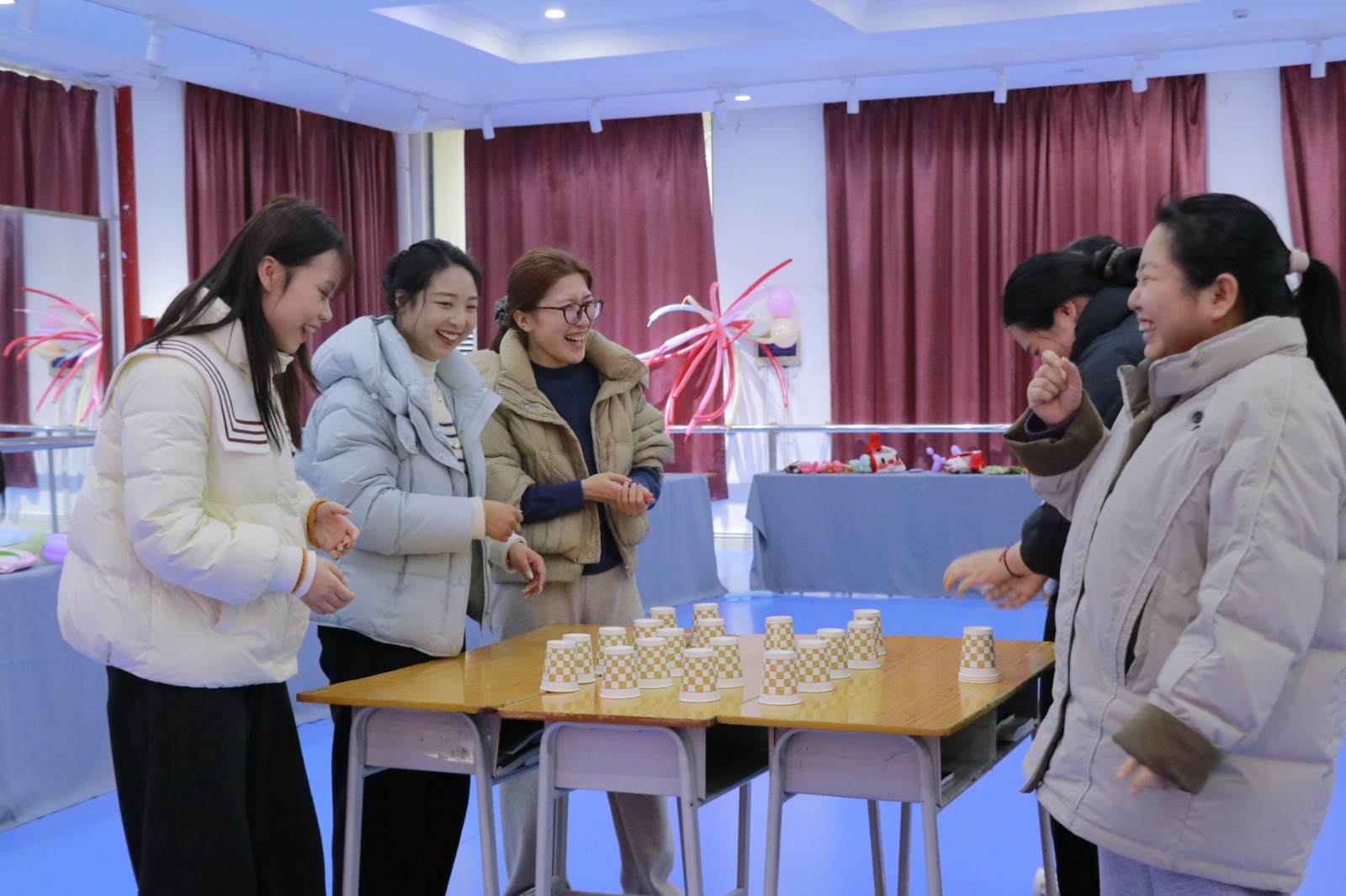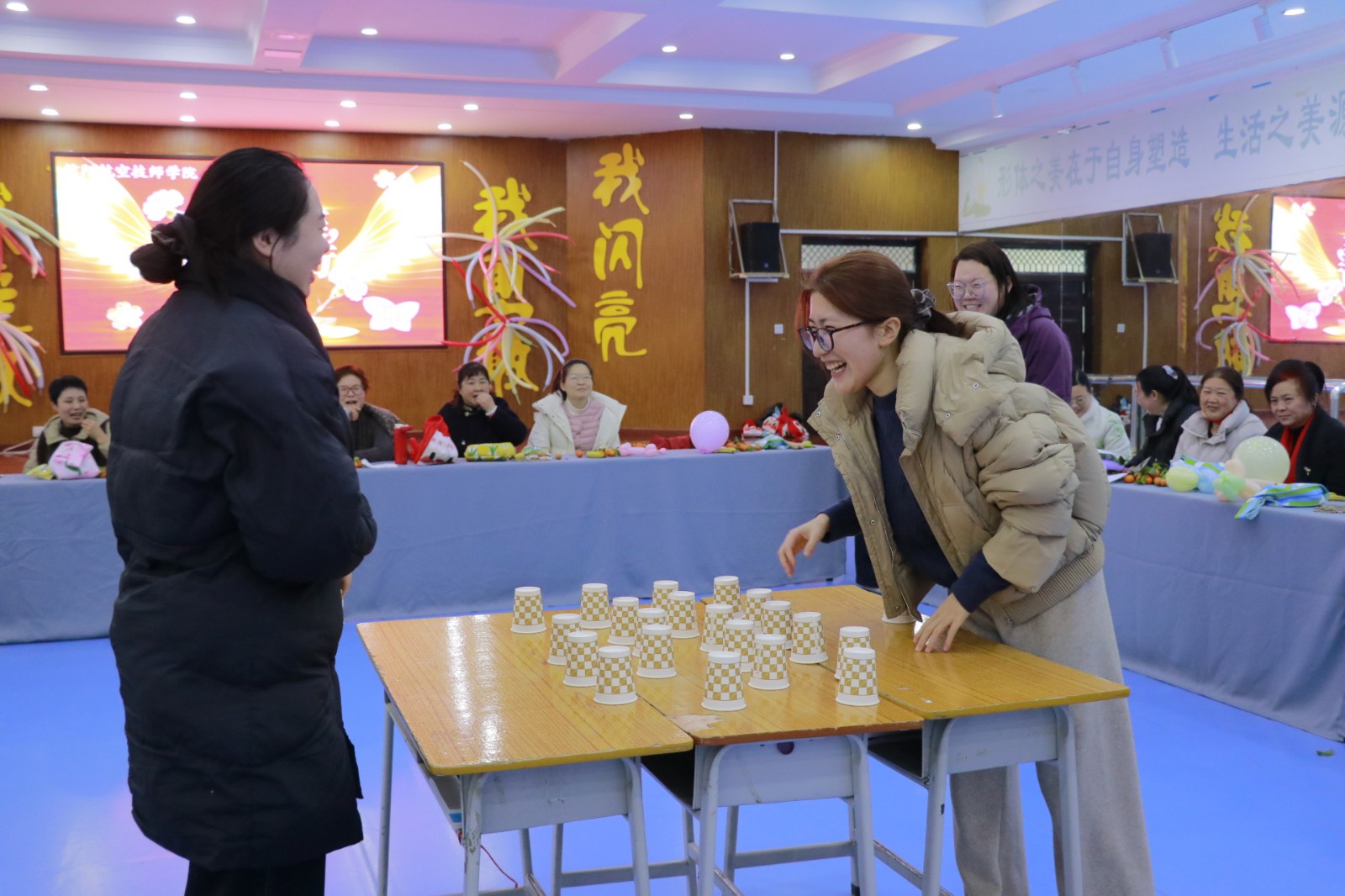 随后,击鼓传花、数字纸杯接力、金龙拍拍操、“步步为营对对碰”等趣味互动游戏轮番登场。师生自由组队、默契配合,现场掌声、欢呼声此起彼伏,气氛热烈而温馨。茶歇区水果、茶点琳琅满目,大家围坐畅谈,分享工作感悟、生活趣事与成长心得,拉近了心与心的距离。